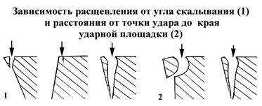 Угол скалывания (угол между внешней поверхностью скола и ударной площадкой). Наиболее оптимальным считается угол около 80-900. Если угол меньше – скол будет очень коротким, если больше – сопротивление материала будет превышать возможности удара и скалывание может не получиться.