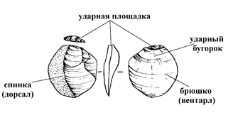 Внутренняя сторона (брюшко или вентрал) скола всегда гладкая. Именно на ней можно увидеть раковистый излом с ударным бугорком.