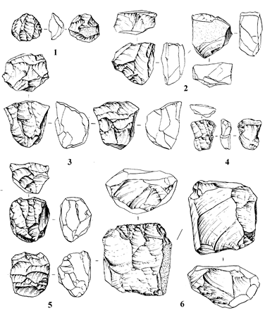 Нуклеус, имеющий один фронт по широкой стороне исходной гальки и одну площадку, называется одноплощадочным монофронтальным нуклеусом. Нередки ситуации, когда нуклеус имеет два и более фронтов. Они могут располагаться на контрфронте, латералях и даже на дистальном и проксимальном (площадке) концах исходного нуклеуса. Соответственно увеличивается количество ударных площадок. В этих случаях используются термины: одноплощадочный бифронтальный, двухплощадочный бифронтальный, двухплощадочный монофронтальный, трехплощадочный бифронтальный и т.д. (рис. 7). Нуклеус, на котором прослеживается более трех фронтов без определенной ориентации, называют ортогональным. У подобного нуклеуса площадки и фронты нередко меняются местами.
