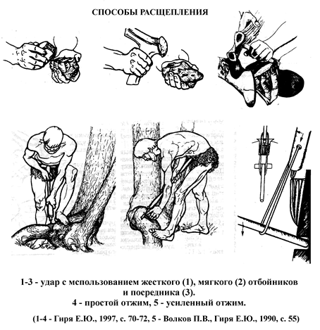 Удар может производиться жестким отбойником (камнем), мягким отбойником (костью или рогом) и с посредником. В последнем случае между отбойником и нуклеусом располагается посредник, как правило, сделанный из кости. Преимущество последнего способа заключается в возможности точно определить место приложения удара.