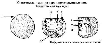 В раннем ашеле существовала клектонская техника, предполагавшая получение необходимых сколов путем не бессистемного дробления, а избирательного, конкретно-ситуационного расщепления. После первого скола с нуклеуса подбиралось место для следующего. Таким образом, каждое снятие подчинялось конкретной цели и зависело от предыдущих сколов, от складывающейся ситуации на камне (рис. 10). Клектонские нуклеусы имели, как правило, две площадки. Скалывание производилось на наковаленке покрытой берестой или шкурой.