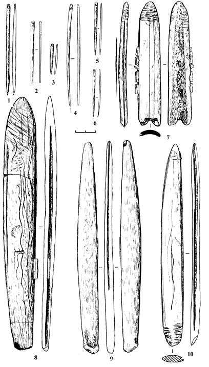 Иглы (рис. 31)появились в начале позднего палеолита (известны в памятниках ориньяка). Основной функцией их было протаскивание нитки в отверстие, подготовленное каменной проколкой или костяным шилом. Первые иглы имели круговую нарезку вместо ушка, позволявшую закреплять нить. Как правило, самые древние ушки имели круглую форму, более поздние – овальную. К концу палеолита появляется канал для вдевания нитки.