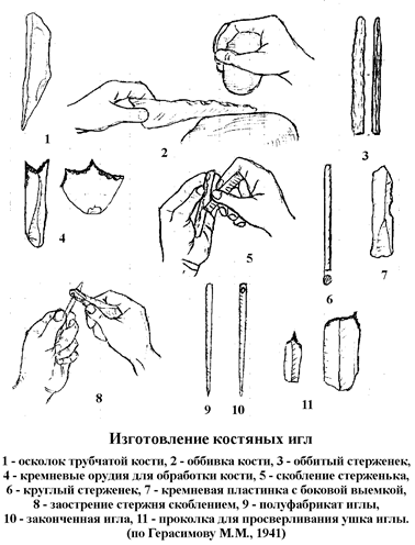 Иглы изготавливались из осколка кости или бивня. Процесс изготовления включал оббивку стерженька, выстругивание отщепом или пластинкой с выемкой, биконическое сверление проверткой, зашлифовку (рис. 32).