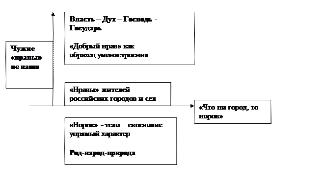 С помощью этой схемы мы наглядно показываем структуру отношений между понятиями «нрав» и «норов». В основе этой схемы лежит традиционная модель российского социума, которая складывается из «властной вертикали» и «родовой, народной, природной горизонтали». При этом «нрав» и «норов» относятся к противоположным сферам бытия человека − духовной и телесной. Согласно христианской традиции, «нравоучение» должно было регулировать отношения господства и подчинения, начиная с семейных отношений, а также половые отношения. Нарушение «нравных» норм, основанных на божеских заповедях, законных предписаниях, обычаях и обрядах считалось грехопадением, срамотой, развратом, злонравием.