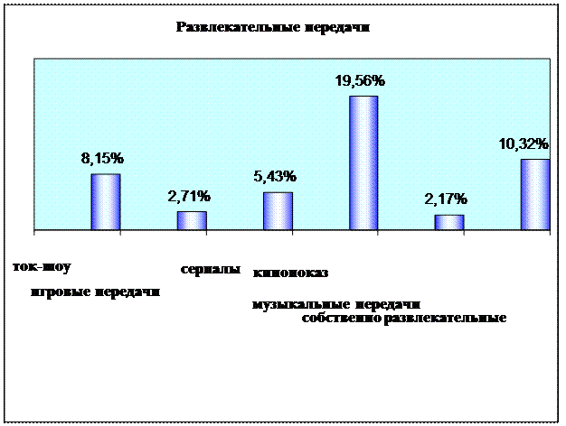 1) преобладают передачи развлекательного содержания (примерно 48% от общего объема вещания). К ним относятся: