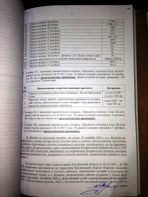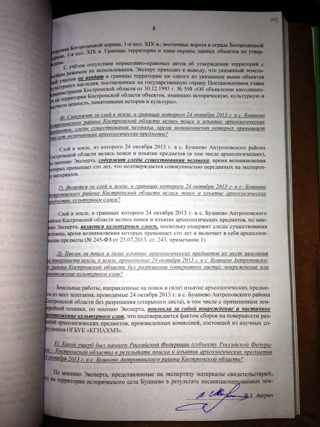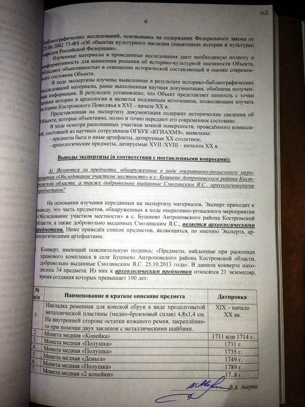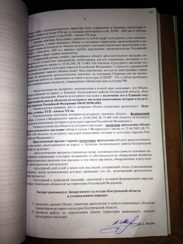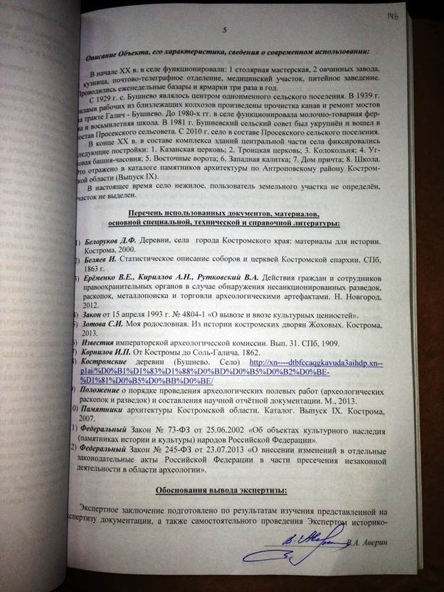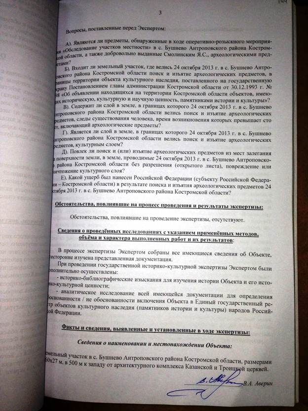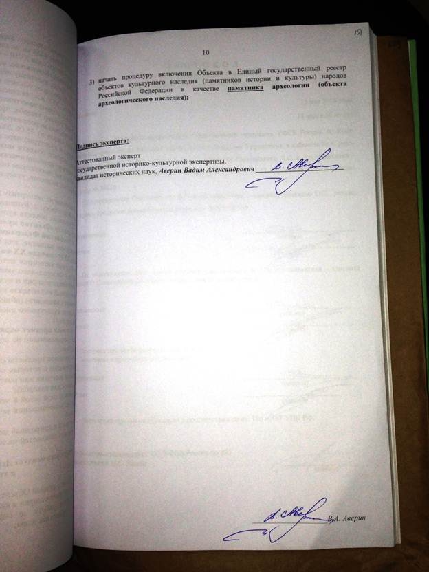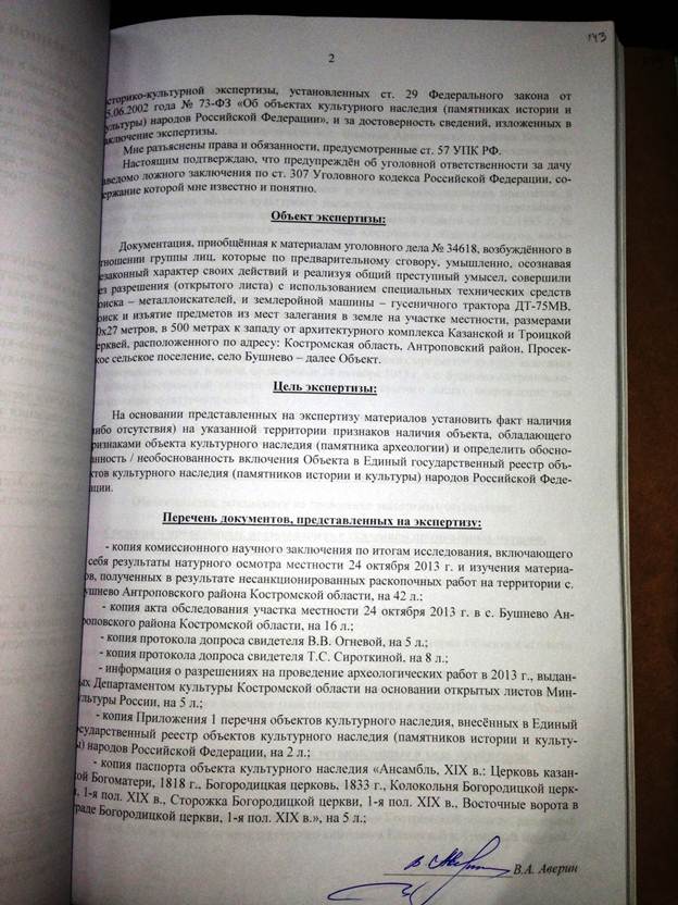 Прошу Вас дать мне разъяснение по существу, имеются ли указанные мной в заключении специалиста нарушения законодательства, в т.ч. Федерального закона от 25.06.2002 года № 73-ФЗ «Об объектах культурного наследия» при проведении экспертом Авериным В.А. государственной историко-культурной экспертизы 17 марта 2014 г.