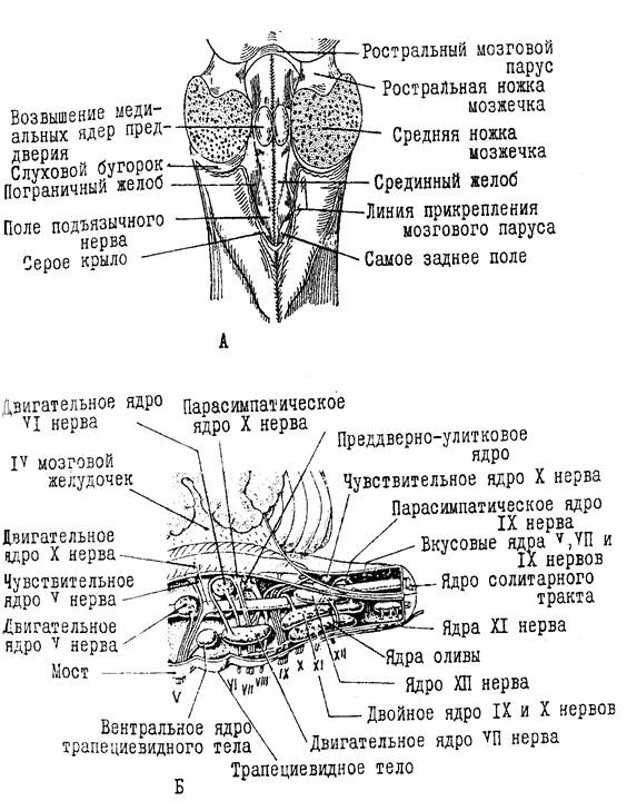 А – ромбовидная ямка; Б – ядра продолговатого мозга;