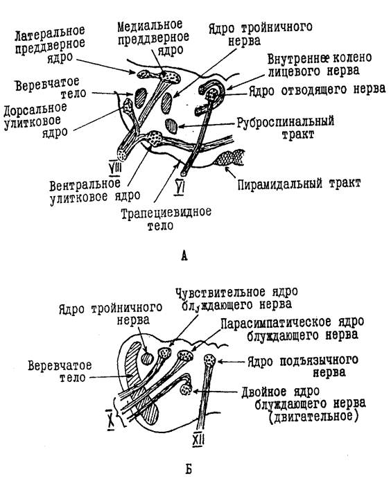 А - на уровне трапецевидного тела; Б – на уровне выхода подъязычного нерва; VI – XII – корешки черепных нервов.
