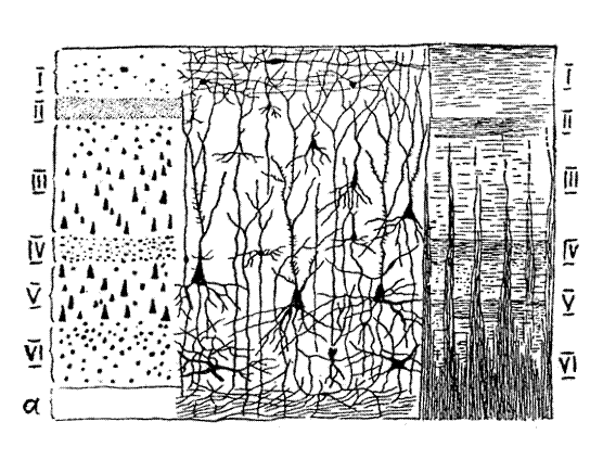 III – слой малых пирамидальных клеток, IV – внутренний зернистый слой, V – слой больших пирамидальных клеток, VI - полиморфный слой, α – белое мозговое вещество