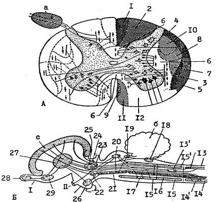 Рис. 15. Ядра и проводящие тракты спинного (А) и головного (Б) мозга: 1 – стройный пучок, 2 – клиновидный пучок, 3 – спинкоталамический тракт, 4 – спиномозжечковый дорсальный тракт, 5 – спиномозжечковый вентральный тракт, 6 – собственные пучки, 7 – преддверноспинномозговой тракт, 8 – красноядерноспинномозговой тракт, 9 – спиннокрышечный тракт, 10 – латеральный пирамидальный тракт, 11 - вентральный пирамидальный тракт, 12 – вентральный покрышка – спинномозговой тракт, 13 – дорсальный канатик, спинного мозга, 13I – стройное и клиновидное ядра, 14 – вентральный канатик спинного мозга, 14I – двигательные ядра спинного мозга, 15 – двигательные и 15I – чувствительные ядра продолговатого мозга, 16 – ретикулярная формация продолговатого мозга, 17 – пирамидальный тракт, 18 – улитковое ядро, 19 – каудальный и 20- ростральный холмики, 21 – красное ядро и ретикулярная формация среднего мозга, 22 - каудальное вентральное ядро зрительного бугра, 23 – латеральное – 24 – медиальное коленчатые тела, 25 – дорсальное ядро зрительного бугра, 26 – ядра подбугорья, 27 – полосатое тело, 28 – обонятельная луковица, 29 – грушевидная доля, а - чувствительный ганглий, б – мозжечок, с - кора большого мозга, I – обонятельный тракт, II – зрительный тракт.
