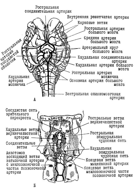 Б – эпидуральные чудесные сети (дно полости черепа)