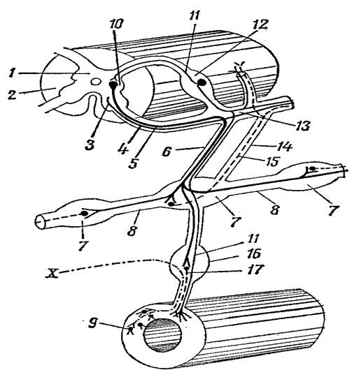 1 – серое мозговое вещество спинного мозга; 2 – белое мозговое вещество спинного мозга; 3 – двигательные волокна; 4 – вентральный корешок; 5 – преганглионарное волокно нейрона; 6 – белая соединительная ветвь; 7 – узел пограничного ствола; 8 – пограничный симпатический ствол; 9 - интрамуральные ганглии в стенке кишечника; 10 – латеральный столб серого мозгового вещества; 11 – чувствительные волокна; 12 – дорсальный корешок спинномозгового узла; 13 – смешанный спинномозговой нерв; 14 – серая соединительная ветвь; 15 – постганглионарное волокно нейрона к сосудам; 16 - превертебральный ганглий; 17 - постганглионарное волокно нейрона к внутренностям; Х – вагус.