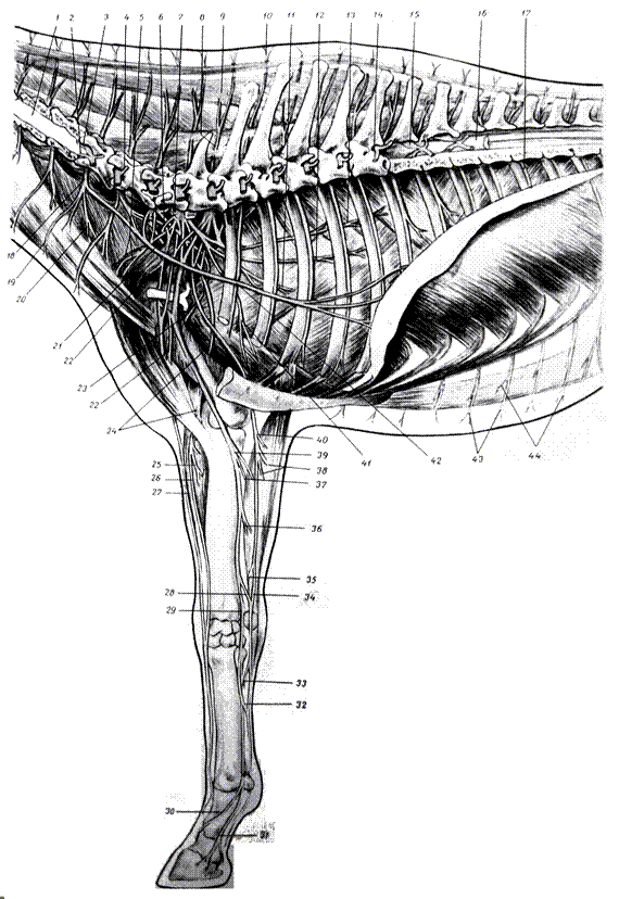 1 - шейная часть спинного мозга, 2 – вентральный корень спинномозгового нерва, 3 – дорсальный корень спинномозгового нерва,4 – дорсальная ветвь шейного спинномозгового нерва, 5 – краниальные грудные нервы, 6 – плечевое сплетение, 7 – подлопаточный нерв, 8 - дорсальная ветвь спинномозгового нерва, 9 – дорсальная мышечная ветвь спинномозгового нерва, 10 – кожная дорсальная ветвь спинномозгового нерва, 11 – грудной латеральный нерв, 12 – грудной дорсальный нерв, 13 – грудной длинный нерв, 14 – грудной спинномозгового нерва, 15 – спинномозговой узел, 16 – грудная часть спинного мозга, 17 – межреберный нерв, 19 - вентральная ветвь спинномозгового нерва, 20 – мышечная вентральная ветвь спинномозгового нерва, 21 - предлопаточный нерв, 22 – мышечные ветви кожно-мышечного нерва, 23 – подмышечный нерв, 24 – лучевой нерв, 25 – глубокий лучевой нерв, 26 – поверхностный лучевой нерв, 27 – кожная ветвь мышечнокожного нерва, 28 – пальмарный латеральный нерв, 29 – пальмарный медиальный нерв, 30 – дорсальный пальцевый нерв, 31 – пальмарный медиальный пальцевый нерв, 32 - соединительная ветвь от медиального к латеральному пальмарному нерву, 33- нерв межкостного среднего мускула, 34 – пальмарная ветвь локтевого нерва, 35 – дорсальная ветвь локтевого нерва, 36 – межкостные ветви лучевого нерва, 37 – межкостный нерв, 38 – мышечные ветви локтевого нерва, 39 – срединный нерв, 4 – локтевой нерв, 41 – грудной вентральный нерв, 42 - диафрагмальный нерв, 43 – кожные ветви межрёберных нервов, 44 – мышечные ветви межрёберных нервов