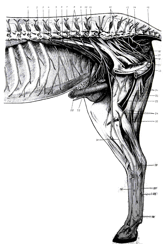 1 – спинномозговой нерв, 2 – дорсальная ветвь спинномозгового нерва, 3 – последний межрёберный нерв, 4 – первый поясничный нерв, 5 – дорсальная ветвь поясничного нерва, 6 – подвздошно-подчревный нерв, 7 – подвздошно-паховый нерв, 8 – поясничное сплетение, 9 – пояснично-кожный нерв, 10 – наружный семенной нерв, 11 – бедренный нерв, 12 – крестцовое сплетение, 13 – каудальный ягодичный нерв, 14 – каудальный прямокишечный нерв, 15 – хвостовые нервы, 16 – каудальный кожный нерв, 17 – краниальный ягодичный нерв, 18 – седалищный нерв, 19 – запирательный нерв, 20 – дорсальный удовый нерв, 21 – проксимальные мышечные ветви, 22 – большеберцовый нерв, 23 – малоберцовый нерв, 24 – дистальные мышечные ветви, 25 – плантарный кожный нерв голени, 26 – медиальный кожный нерв голени, 27 – плантарный плюсневый медиальный нерв, 28 - соединительная ветвь плантарных нервов, 30 – глубокая ветвь глубокого малоберцового нерва, 31 – нерв Сафена, 32 – кожно-латеральный нерв бедра.