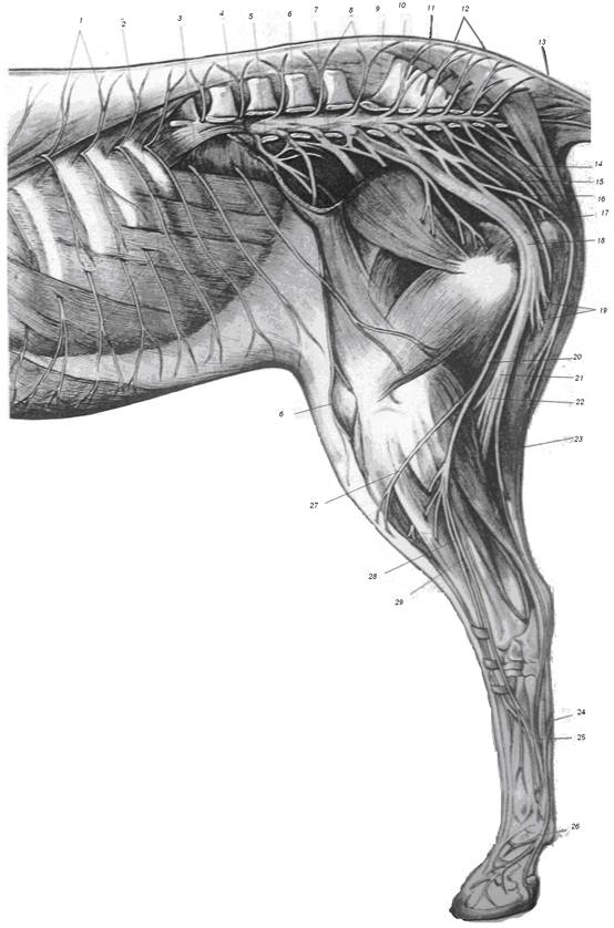1 – дорсальные кожные ветви грудных нервов, 2 - вентральные кожные ветви грудных нервов, 3 – подвздошно-подчревный нерв (кожная ветвь), 4 - подвздошно-паховый нерв, 5 - наружный семенной нерв, 6 - пояснично-кожный нерв, 7 - бедренный нерв, 8 - дорсальные ветви поясничных нервов, 9 - запирательный нерв, 10 –мозговой конус, 11 - краниальный ягодичный нерв, 12 - дорсальные ветви крестцовых нервов, 13 - хвостовые нервы, 14 - каудальный прямокишечный нерв, 15 – срамной нерв, 16 - каудальный кожный нерв, 17 – каудальный ягодичный нерв, 18 - седалищный нерв, 19 - проксимальные мышечные ветви, 20 - малоберцовый нерв, 21 - большеберцовый нерв, 22 - дистальные мышечные ветви, 23 – плантарный кожный нерв голени, 24 – плантарный плюсневый латеральный, 25 – ветви для межкостного мускула и латеральный глубокий плюсневый нерв, 26 – плантарный пальцевый латеральный нерв, 27 – дорсальный кожный нерв голени, 28 – глубокий малоберцовый нерв, 29 – поверхностный малоберцовый нерв.