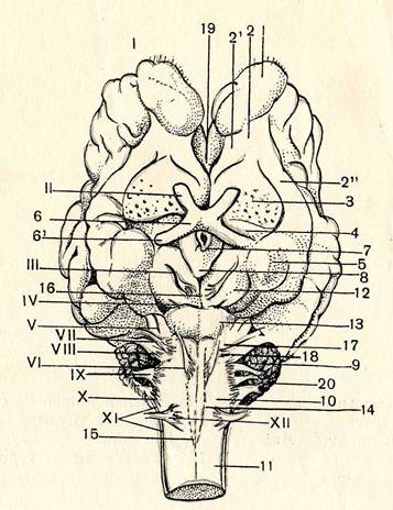 I – обонятельный нерв, II – зрительный нерв, III – глазодвигательный нерв, IV – блоковый нерв, V – тройничный нерв, VI – отводящий нерв, VII – лицевой нерв, VIII – равновесно-слуховой нерв, IX – языкоглоточный нерв, X – блуждающий нерв, XI – добавочный нерв, XII – подъязычный нерв, 1 – обонятельная луковица, 2 – общий обонятельный тракт, 3 – обонятельный треугольник, 4 - продырявленная пластинка, 5 – грушевидная доля, 6 – перекрест зрительный нервов, 7 – воронка, 8 – сосцевидное тело, 9 – сосудистое сплетение, 10 - продолговатый мозг, 11 – спинной мозг, 12 – ножки большого мозга, 13 – варолиев мост, 14 – пирамиды, 15 – их перекрест, 16 – межножковая ямка, 17 – трапециевидное тело, 18 - лицевой бугор, 20 мозжечок.