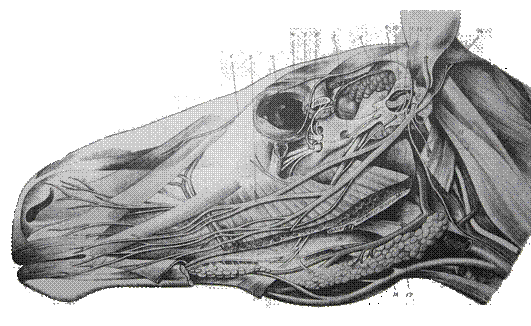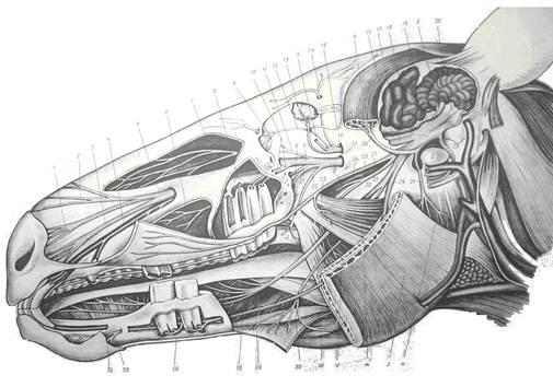 1 – ростральный носовой нерв, 2 – наружные носовые нн., 3 – н. верхней губы, 4 – верхняя резцовая ветвь, 5 - подглазничный н., 6 – каудальный носовой н., 7 – решётчатый н., 8 – нн. предпоследнего верхнего моляра, 9 – ветвь к железе 3-го века, 10 - нн. последнего верхнего моляра, 11- скуловой н., 12 – подблоковый н., 13 – слёзный н., 14 – лобный н., 15 - височно-скуловая ветвь, 16 – глазничная ветвь, 17 - верхнечелюстная ветвь, 18 - нижнечелюстная ветвь, 19 – полулунный узел, 20 – начало тройничного н., 21 – большой нёбный н., 22- малый нёбный н., 23 – ветвь к латеральной крыловой мышце, 24 – ветвь к напрягателю и поднимателю нёбной занавески, 25 – щёчный н., 26 – глубокие височные нн., 27 – крыловой н., 28 – поверхностный височный н., 29 – альвеолярный нижнечелюстной н., 30 – межчелюстной н., 31 – жевательный н., 32 – нижняя резцовая ветвь, 33 – подбородочный н., 34 – ветвь к премоляру, 35 – язычный н., 36 – ветвь к двубрюшному м., а – височная мышца, б – варолиев мост, в - напрягатель и подниматель нёбной занавески, г - суставной отросток нижней челюсти, д – нёбная занавеска, е – медиальная крыловая м., ж – латеральная крыловая м., з – латеральная большая жевательная м., и – медиальная большая жевательная м.