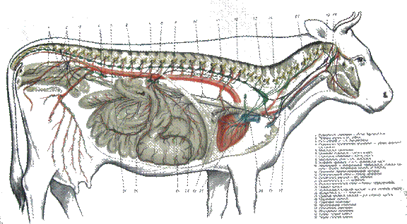 1 – подчревное сплетение, 2 – тазовые нервы, 3- подчревный нерв, 4 – каудальное брыжеечное сплетение, 5 – межузловое сплетение, 6 – почечное сплетение, 7 – солнечное сплетение, 8 – полулунный ганглий, 9 – большой чревный н., 10 – дорсальный и вентральный пищеводные стволы вагуса, 11 – сплетение бронхо-пищеводной артерии, 12 – симпатический ствол, 13 – звёздчатый ганглий, 14 – позвоночный нерв, 15 – вагосимпатический ствол, 16 – ганглии вагуса, 17 – краниальный шейный ганглий, 18 – возвратный нерв, 19 – средний шейный ганглий, 20 – сердечный ганглий, 21 – сердечное сплетение, 22 – бронхиальное сплетение, 23 – почечное сплетение, 24 – желудочное сплетение, 25 – нервы тонкой кишки, 26 нервы толстой кишки.