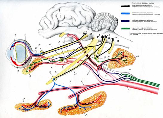 II – зрительный нерв, III – глазодвигательный н., V – тройничный н., VII – лицевой н., IX – языкоглоточный н., 1 – нервные окончания в мышцах радужной оболочки и ресничного тела, 2 - нервные окончания в сосудах глазного яблока, 3 – ресничный узел, 4 – клинонёбный узел, 5 – большой глубокий каменистый н., 6 – большой поверхностный каменистый н., 7 – ядро Якубовича, 8 – слёзоотделительное ядро, 9 – краниальное слюноотделительное ядро, 10 – каудальное слюноотделительное ядро, 11 – барабанный н., 12, 13 – малый глубокий и поверхностный каменистые нн., 14 – ушной узел, 15 – барабанная струна, 16 - подчелюстной узел, 17 – краниальный шейный симпатический узел, а – глазное яблоко, б – слёзная железа, в – слёзная артерия, г - язычный н., д – клинонёбный н., е – сосуды глазного яблока, ж – подъязычная железа, з – язычная а., и – внутренняя челюстная а., к – наружная челюстная а., л – внутренняя сонная а., м – крыловой н., н – сосуды околоушной железы, о - околоушная железа, п - общая сонная а., р – подчелюстная железа.