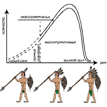 Таким образом, в условиях цивилизации методом целенаправленной селекции снижаются средние уровни примативности и рангового потенциала составляющих общество индивидов. Однако разница в способах селекции вела к различным результатам отбора. Попросту говоря, если тупо рубить головы всем, кто выпендривается, то снижается в среднем больше ранговый потенциал, чем примативность. А если издать разумную систему правил (законов) и рубить головы только тем, кто их не соблюдает, то снижаться в среднем будет больше примативность, чем ранговый потенциал.
