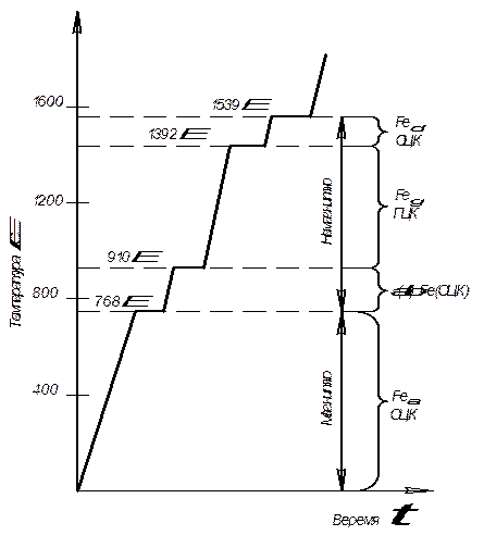 У железа существует и магнитное превращение с точкой Кюри равной 768 градусов по Цельсию. Все превращения изображены на кривой нагрева (рис 1).