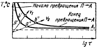 При достаточно высокой температуре из-за большой подвижности атомов превращение протекает практически мгновенно, поэтому кривые начала и конца превращения сливаются и попадают на ось ординат. При очень малом перегреве над А1 превращение протекает очень вяло и поэтому превращение может протекать практически бесконечно. В этом случае кривые начала и конца превращения также сливаются и асимптотически приближаются к линии А1. Совпадение кривых начала и конца превращения в одной точке соответствует равновесному превращению по диаграмме железо-углерод.