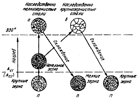 При нагреве до достаточно высокой температуры наследственно мелкозернистая сталь может иметь даже более крупное зерно аустенита, чем наследственно крупнозернистая сталь (рис.4).