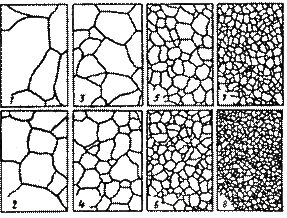 n=8·2N+3, где n- число зерен, помещающихся на 1 мм2 шлифа, N-балл зерна. Условно принято считать, что стали с зерном от 1 до 5 балла относятся к крупнозернистым сталям, а с более высоким баллом зерна (№ 6–15) — к мелкозернистым.