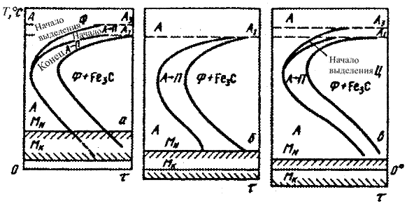 Рис. 8. Схемы диаграммы изотермического превращения переохлажденного аустенита: а) доэвтектоидная сталь; б) эвтектоидная сталь; в) заэвтектоидная сталь
