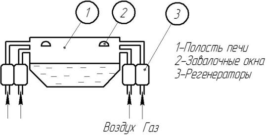 Регенераторы работают попеременно и подогреваются продуктами сгорания, выходящими из рабочего пространства печи. Управление движением продуктов сгорания и газа производится заслонками.