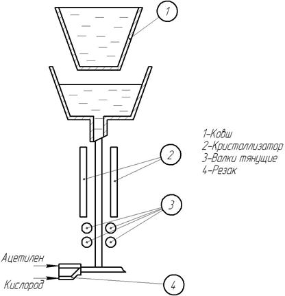 Из кристаллизатора слиток непрерывно вытягивается валками со скоростью равной скорости кристаллизации слитка.