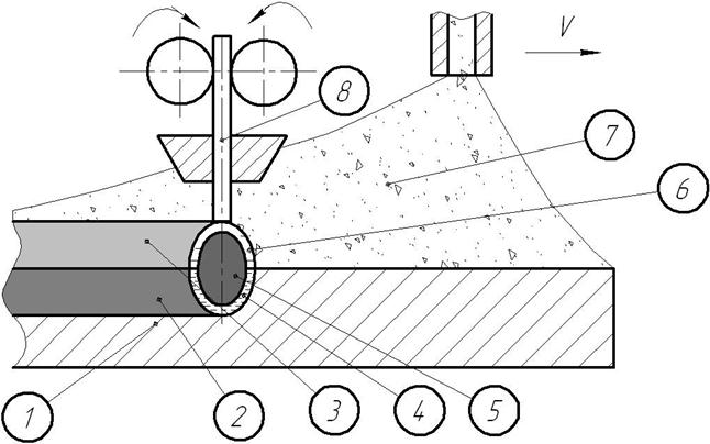 На нем установлен механизм подачи электродной проволоки 8 и устройство для непрерывной подачи в зону сварки флюса 7. Дуга 5 горит между электродом 8 и заготовкой 1. Над сварочной ванной 4 из расплавленного металла образуется шлаковая ванна 6 из расплавленного шлака. По мере продвижения трактора в направлении скорости, происходит затвердевание металлической и шлаковой ванн с образованием сварного шва 2, покрытого твердой шлаковой коркой 3.