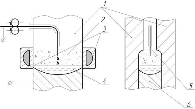 При электрошлаковой сварке крупных заготовок 1 используется тепло, выделяемое при прохождении тока через расплавленный шлак. Это тепло расплавляет кромки заготовок и дополнительный металл (проволоку, стержень, пластину) 5, подаваемые в зону сварки. По мере продвижения сварочной ванны 4 и охлаждения ползунов 3 металл кристаллизуется, образуя шов 6.