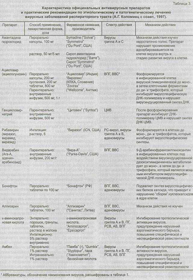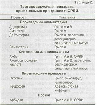 Материалы, суммирующие сведения по этио-тропной и патогенетической терапии гриппа и других ОРВИ, представлены в таблицах 2 и 3.