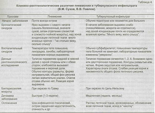 либо невысокая квалификация рентгенолога, не владеющего дифференциацией туберкулезных и нетуберкулезных изменений легочной ткани. Инфильтрат локализуется в верхней доле легкого гораздо чаще при туберкулезе, чем при острой пневмонии. Рентгенологически туберкулезный инфильтрат характеризуется округлой формой, четкими контурами, тень интенсивная, видны очаги обсеменения в виде свежих «мягких» теней. Общий фон легочного рисунка не изменен, корни легких не расширены. Как правило, определяется «дорожка» к корню легкого. Рассасывание инфильтрата медленное, в течение 6-9 мес. Возможно формирование полости распада. Фокус пневмонической инфильтрации визуализируется, как правило, в нижней доле. Форма его неправильная, контуры размыты, интенсивность тени слабая, общий фон легочного рисунка усилен. Очаги обсеменения и дорожка к корню отсутствуют. Рассасывание пневмонического инфильтрата, как правило, происходит в течение 1-4 нед. Основные критерии дифференциации пневмонии и туберкулезного инфильтрата показаны в таблице 4.