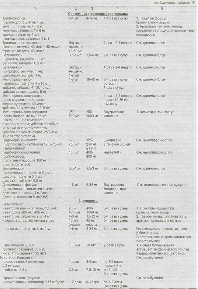 Системные глюкокортикостероиды. Средняя терапевтическая доза преднизолона - 20-30 мг (4-6 табл. в сутки) или эквивалентные дозы других пероральных глюкокортикостероидов (обычно 4-6 табл., распределенных равномерно в течение дня). Через 7-14 дней - постепенное снижение доз, отработка поддерживающей дозы (обычно 5-10 мг преднизолона, эквивалентные дозы других системных глюкокортикостероидов, утром). В период ремиссии можно сделать попытку снизить дозировку системных глюкокортикостероидов (постепенно, по 2,5 мг преднизолона в течение недели), назначив ингаляционные глюкокортикостероиды в суточной дозе 400-1000 мкг. У пациентов с тяжелым течением астмы можно одновременно назначать ингаляционные и системные глюкокортикостероиды.
