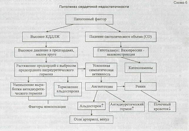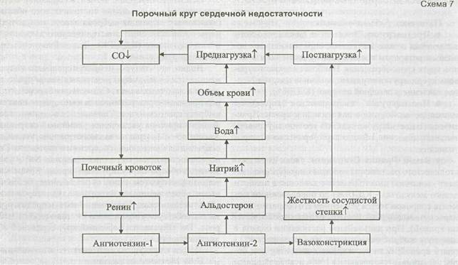 Видно, что «запуск» нейрогуморального модуля начинается с увеличения давления в левом предсердии и в легочных венах. Стимуляция барорецепто-ров приводит к раздражению вазомоторного центра, выбросу катехоламинов. Уменьшение почечного кровотока - причина увеличения рениновой секреции. Ангиотензин-2 вызывает вазоконстрикцию, усиление секреции альдостерона, гиперсимпатикотонию. Ги-перальдостеронизм - причина задержки Na° и увеличения объема циркулирующей крови. Компенсаторные факторы (см. схему 6) оказываются бессильными перед ренин-ангиотензин-альдостероновой (РАА) активностью. Увеличение пост- и преднагрузки способствует уменьшению систолического выброса. Так запускается порочный круг сердечной недостаточности.