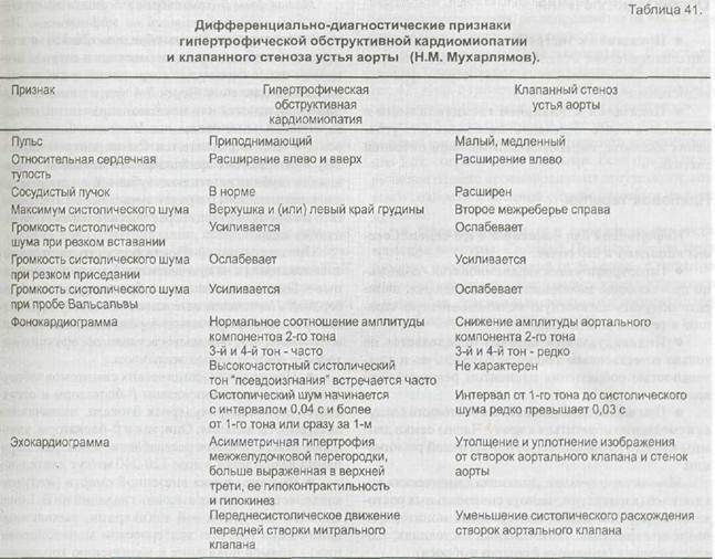 При решении вопроса о диагнозе у больного с кардиалгией и впервые выявленными описанными выше изменениями ЭКГ следует исходить из вероятности более опасного заболевания - ИБС, инфаркта миокарда. Диагностические затруднения будут решены в ходе динамического наблюдения в условиях специализированного стационара. Такая тактика предпочтительна и потому, что гипертрофическая кардиомиопатия может сочетаться с ИБС. Идентификация последней у больных с гипертрофической кардиомиопатией в ряде случаев возможна только после проведения селективной коронарографии. • Гипертрофическая кардиомиопатия и климактерическая миокардиодыстрофия, нейро-циркуляторная дистопия. Кардиалгии в сочетании со слабоотрицательными зубцами Τ на ЭКГ, особенно у эмоционально лабильных лиц или женщин в климактерический период, обычно трактуются как нейроциркуляторная дистония или климактерическая миокардио-дистрофия. При углубленном исследовании таких пациентов с помощью эхо кардиографического метода в ряде случаев удается выявить