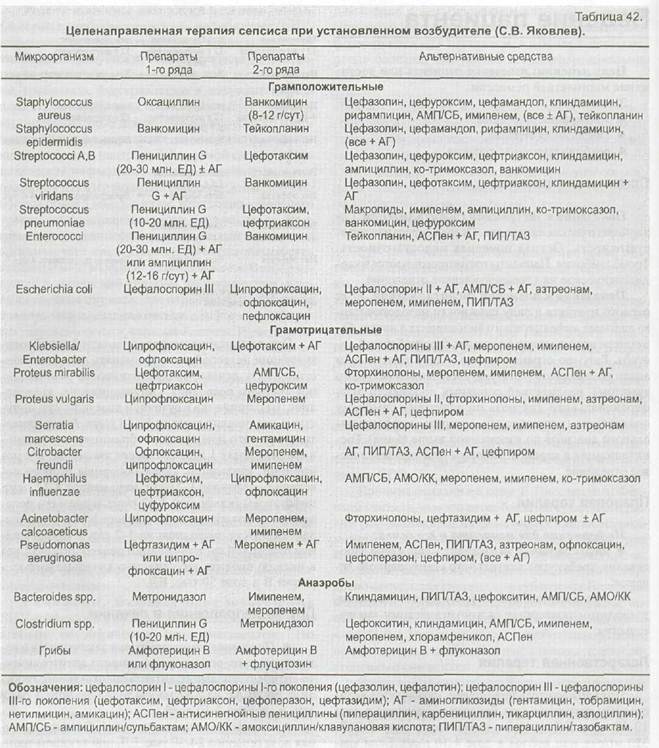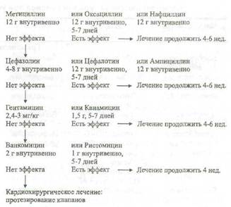 Пока возбудитель не выделен, назначается калиевая или натриевая соль бензилпенициллина в дозе 10-40 млн. ЕД/сут, или гентамицин в дозе 240-320 мг/сут, или кефзол в дозе 4-10 г/сут. Если удалось выделить возбудителя, лечебная тактика меняется (см. табл. 42).