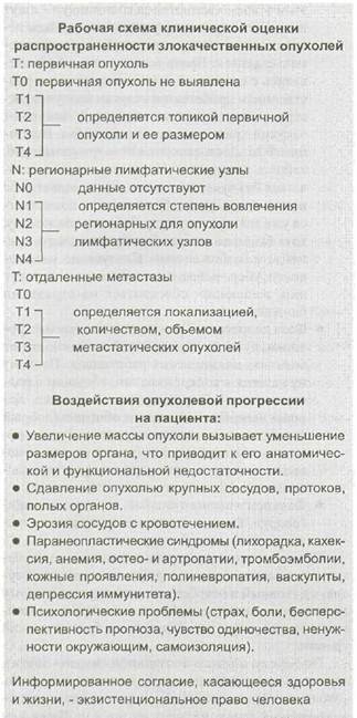Общепрактикующему врачу приходится решать эту трудную клиническую задачу со многими неизвестными, поскольку помимо симптомокомплексов, обусловленных опухолевым ростом, приходится учитывать паранеопластические процессы, «вторые болезни», индуцированные активными методами лечения, обострение существовавших ранее хронических болезней. Главный организационный принцип в ведении таких больных - не рассматривать их как не-курабельных, а в полной мере использовать весь арсенал современной медицины, включающий хирургическую коррекцию опухолевых стенозов путем паллиативных операций, ликвидацию гнойных осложнений, симптоматическую терапию. Для этого больной запущенными формами рака должен получать своевременные консультации онколога, хирурга, гематолога, невропатолога и других специалистов.