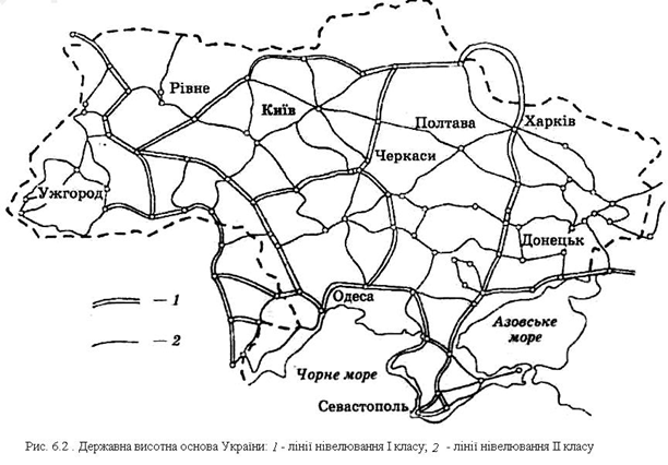 Висотна державна геодезична мережа України побудована відповідно до Основних положень про державну мережу СРСР 1961 р. і складається з нівелірних мереж І, II, III, IV класів, створених методом геометричного нівелювання. Лінії нівелювання! І та II класів (рис. 2) є головною висотною основою України, яка забезпечує галузі народного господарства, оборону країни, розв'язання науково-технічних завдань. їх прокладено вздовж автомобільних та залізничних шляхів. Довжина ліній нівелювання І класу становить 11 975 км, а II – 11 900 км. Висоти закріплених марок і реперів визначені в Балтійській системі висот 1977 р.
