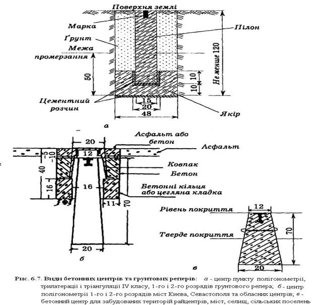 Пункти тріангуляції, трилатерації і полігонометрії закріплюють на місцевості закладанням у землю спеціальних знаків. Залежно від кліматичних умов і фізичних властивостей ґрунту конструкції знаків бувають різними. Зокрема, знак, що закладається на пунктах тріангуляції усіх класів при глибині промерзання ґрунту до 1,5 м, являє собою бетонний пілон із закладеними в нього чавунними марками (рис. 5, 6).