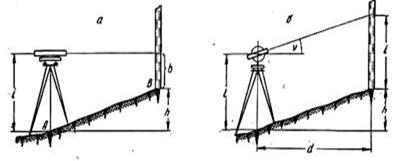• тригонометричне – виконується за допомогою теодоліта і базується на принципі похилого променя візування (рис. 1, б);