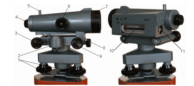 Нівелір будь-якої конструкції складається з трьох основних частин: зорової труби, з сіткою ниток для зняття відліків по рейці; пристрою, що забезпечує горизонтальне положення лінії візування і підставки з пристроєм для приведення приладу в робоче положення.