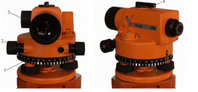 1 – лімб; 2 – окуляр; 3 – круглий рівень; 4 – кришка-дзеркало;