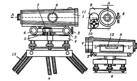 Рис. 4. Нівелір Н-3: а – загальний вигляд; б – вигляд з боку камери циліндричного рівня; 1 – зорова труба; 2 – закріпний гвинт труби; 3 – навідний гвинт труби; 4 – підставка нівеліра з підйомними гвинтами; 5 – виправні гвинти круглого рівня; 6 – еліваційний гвинт труби; 7 – круглий рівень; 8 – гвинт фокусування (кремальєрний) труби; 9 – камера циліндричного рівня; 10 – виправні гвинти циліндричного рівня; 11 – заслінка циліндричного рівня; 12 – циліндричний рівень; 13 – штатив.
