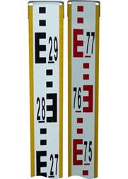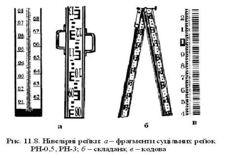 Нівелірні рейки виготовляють із витриманих, спеціально оброблених ялинових або соснових брусків, пластмас, металу або інших матеріалів, які відповідають вимогам до рейок (рис. 7). Поділки на рейках нанесені у вигляді сантиметрових шашечок, які оцифровані через сантиметр. Рейки, як правило, трьохметрові, двосторонні: основна шкала – чорна, додаткова – червона.