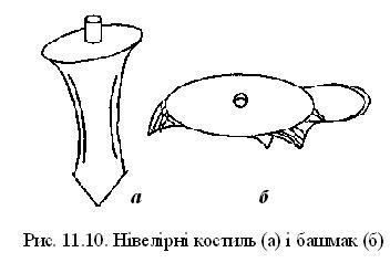 При нівелюванні рейки встановлюють на кілки, металічні костилі або башмаки. Нівелірні башмаки являють собою металічні злитки (рис. 9) у вигляді пластинок зі сферичними головками посередині. Під час нівелювання, попередньо знявши дерн, башмаки кладуть на ґрунт і встановлюють на них рейки п’яткою донизу.