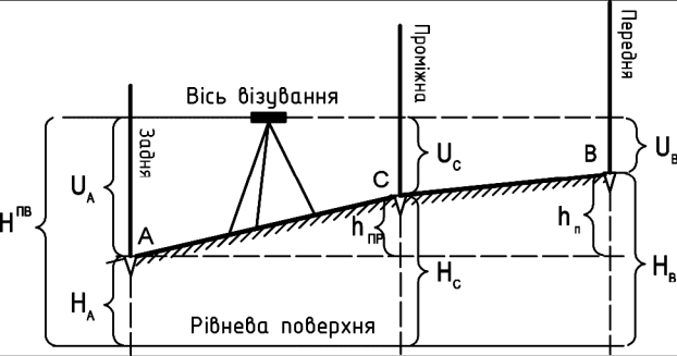 Тобто відмітка точки дорівнює висоті променя візування мінус відлік по рейці, встановленій на цій точці.