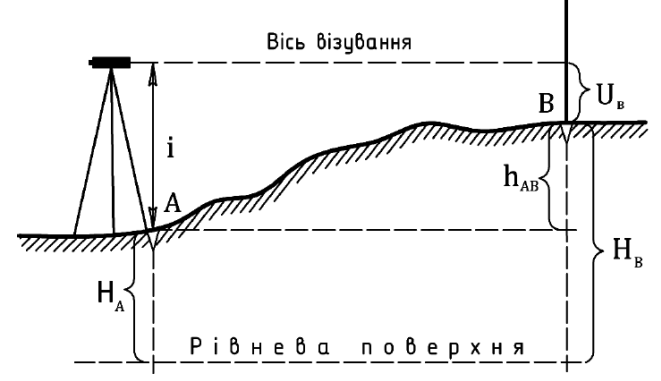 Повертають зорову трубу на точку точками hAB обчислюють за формулою